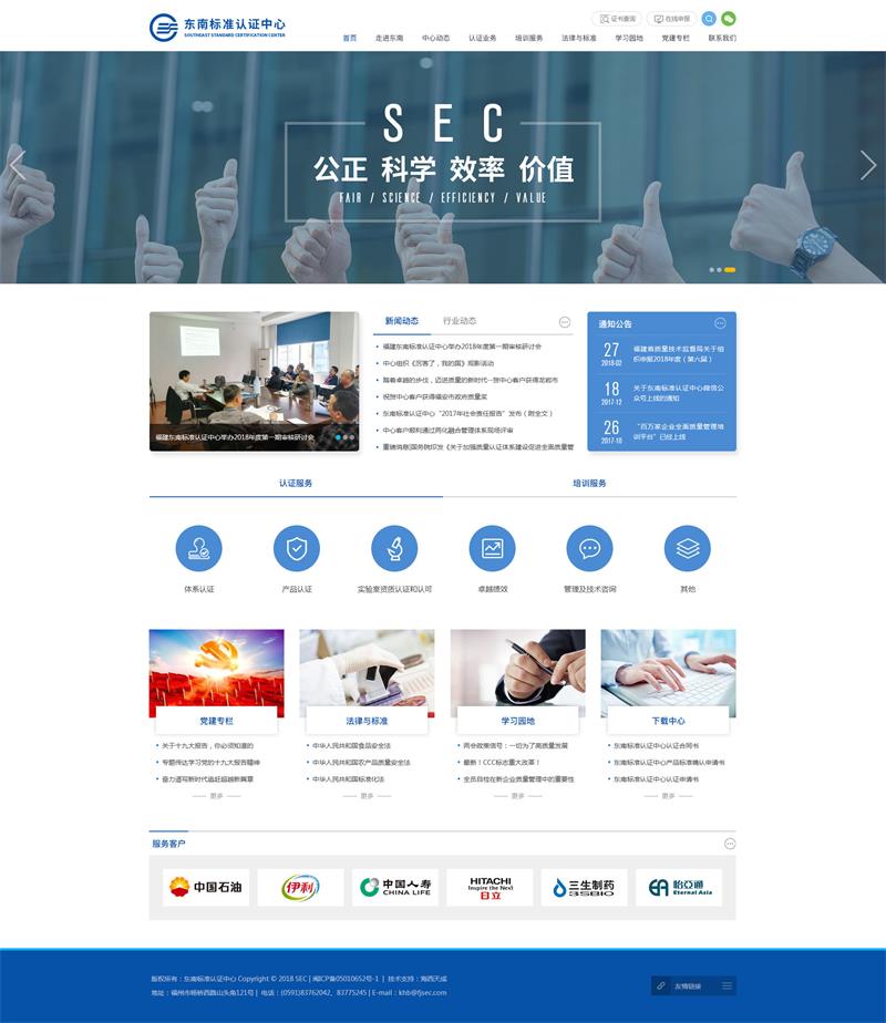 海西天成已第三次為福建東南標準認證中心(http://www.fjsec.com)官網(wǎng)進行改版服務,此次全新改版后的官網(wǎng)將實現(xiàn)“全站響應式”,還增加了微信公眾號相結合,訪問方式更加方便。