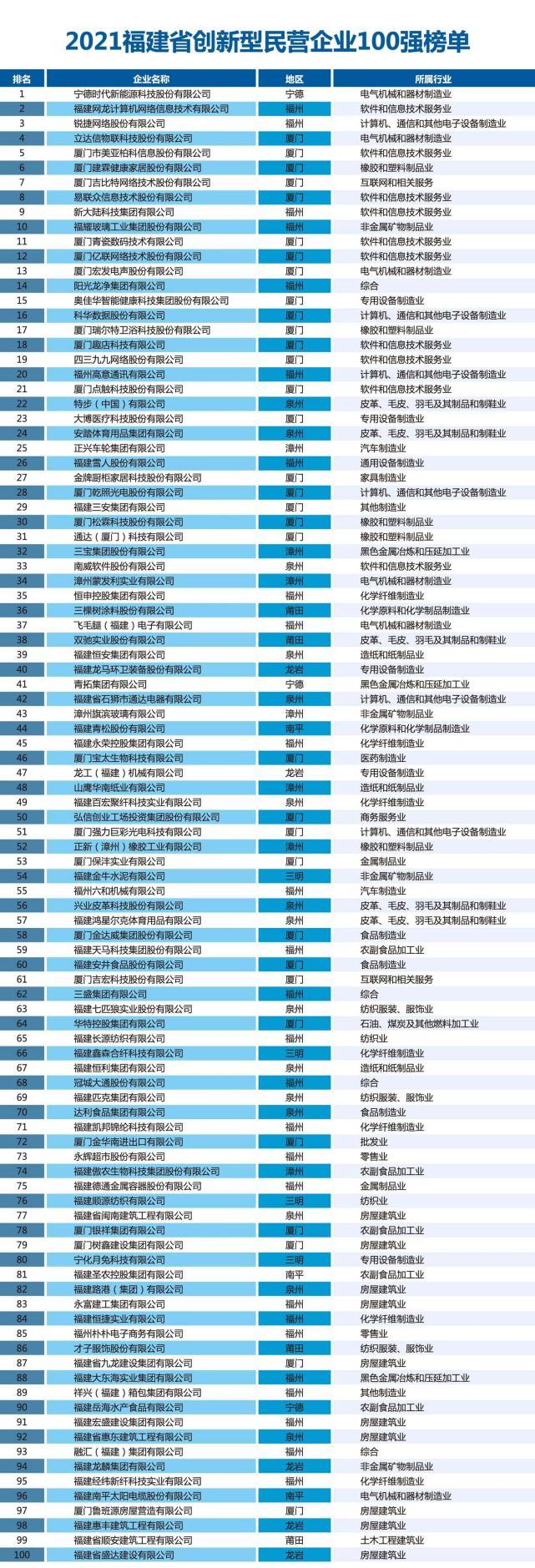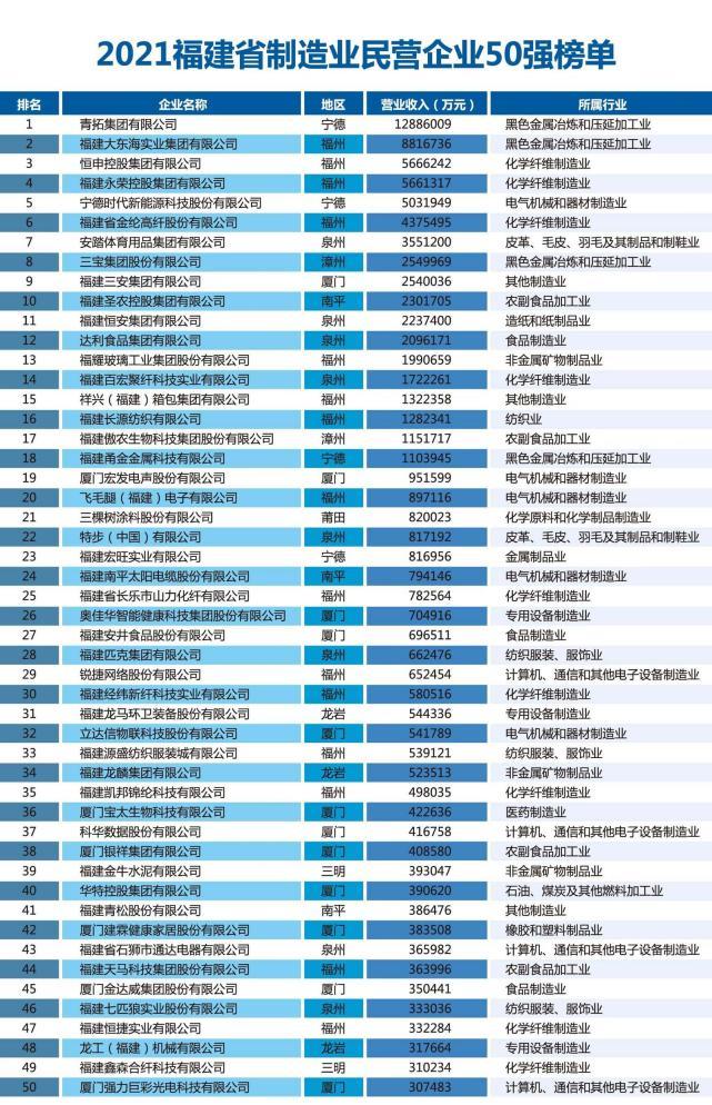 10月15日,福建省工商聯(lián)在三明發(fā)布“2021福建省民營企業(yè)100強(qiáng)”“2021福建省創(chuàng)新型民營企業(yè)100強(qiáng)”“2021福建省民營企業(yè)制造業(yè)50強(qiáng)”榜單,同時發(fā)布《2021福建省民營企業(yè)100強(qiáng)分析報告》《2021福建省民營企業(yè)社會責(zé)任報告》。報告顯示,福建省民營經(jīng)濟(jì)高質(zhì)量發(fā)展成色明顯,成為經(jīng)濟(jì)社會發(fā)展的重要力量和創(chuàng)造社會財富的重要來源。